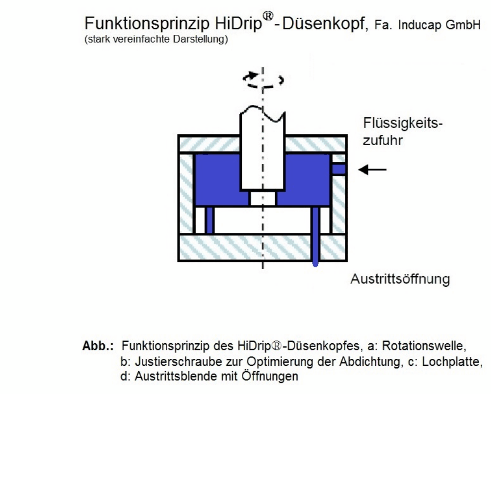 Beschreibung der HiDrip®-Technologie Die Hauptkomponente der von Inducap® entwickelten HiDrip®-Technologie bildet der HiDrip®-Düsenkopf mit einer unterhalb befestigten Düsenblende mit Austrittsöffnungen. Die Flüssigkeit wird unter Überdruck in den HiDrip®-Düsenkopf gefördert. Der Volumenstrom der aus den Öffnungen der Düsenblende austretenden Flüssigkeit wird mit Hilfe einer im Inneren des HiDrip®-Düsenkopfes rotierenden Lochplatte mit Abdichtwirkung je nach Ausführung (Bauform) und Einstellung mit bis zu 12.000 Hz in wechselnder Folge unterbrochen und wieder freigegeben. Als Folge der hochfrequenten, wechselnden Unterbrechung mit nachfolgender Freigabe tritt die Flüssigkeit aus den Öffnungen der Düsenblende als pulsierende, separate Tropfen in nahezu monodisperser Tropfengrößenverteilung entsprechend der vorgewählten Frequenz aus. Die sphärischen Tropfen (Mikrotropfen) können anschließend durch Kühlung oder chemische Reaktion verfestigt werden und liegen in enger Partikelgrößenverteilung in Form von festen Mikrokugeln oder auf Wunsch auch in Form von festen Mikrolinsen als Endprodukt vor.
